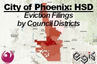 Description: The 8 Council Districts of the City of Phoenix. This dataset is a copy of the authoritative Council Districts feature class, with an additional column indicating the number of eviction filings within each district. The number of eviction filings is carried over from the Eviction Filings point feature class, which consists of the geocoded addresses of defendants in eviction filings within the Phoenix city limits. The Maricopa County Justice Courts (MCJC) originally provides this data as a spreadsheet which lists all eviction filings within Maricopa County. Currently this feature class reflects eviction filings in the Phoenix city limits as of November 2025 and should be regularly updated as MCJC updates their eviction filing reports.